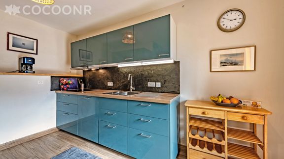 - Une cuisine équipée avec notamment : bouilloire électrique, four, four à micro-ondes, grille-pain, lave-vaisselle, plaques de cuisson...