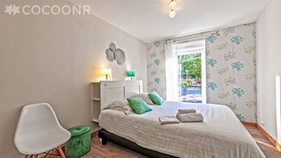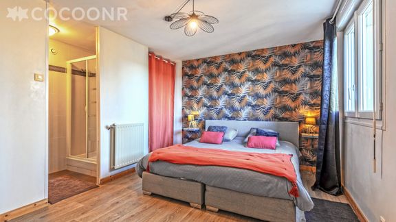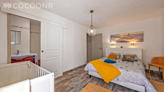 - Chambre 1 : un lit queen-size (160x200), un lit bébé, salle de bain attenante avec baignoire balnéo et douche, meuble vasque