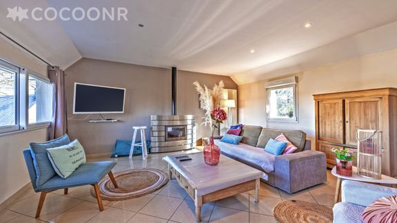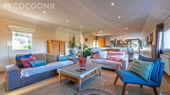 - Une pièce de vie de 88 m² avec canapés, fauteuil, TV