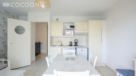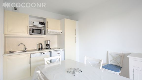 - Une cuisine équipée avec notamment : bouilloire électrique, four à micro-ondes, grille-pain, lave-vaisselle, plaques vitro céramique, machine à café à filtre...