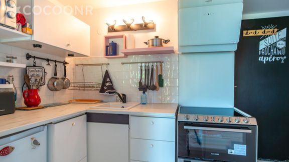 - Une cuisine équipée avec notamment : bouilloire électrique, four, four à micro-ondes, grille-pain, lave-vaisselle, plaques de cuisson...