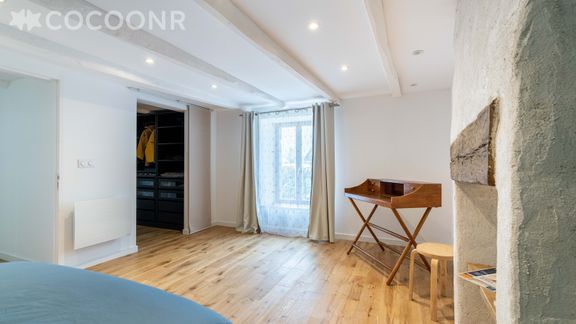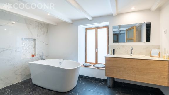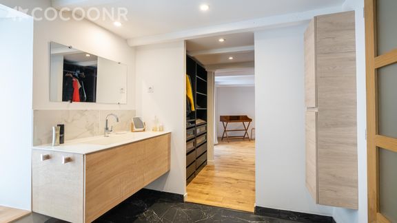 - Chambre 1 : au premier étage, une suite parentale avec un lit queen-size (160 cm x 200cm), un dressing ainsi qu'une salle de bain avec douche à l’italienne, bain à bulles, une grande vasque, un WC séparé et un espace lingerie.