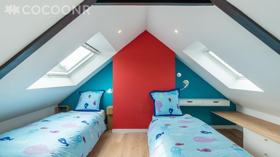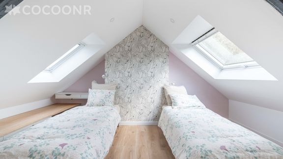 - Chambre 2 : au deuxième étage, deux lits simples (80 cm x 200 cm) pouvant être rapprochés et former un lit double queen-size (160 cm x 200 cm).
