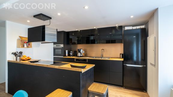 - Cuisine ouverte sur le séjour et entièrement équipée : un four, un réfrigérateur, des plaques de cuisson, un lave-vaisselle, un micro-ondes, un grille-pain, une machine à café Nespresso, une bouilloire électrique, de la vaisselle et des couverts.