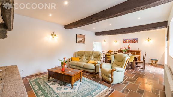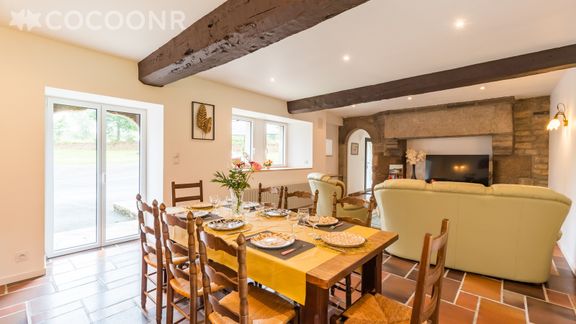 - Une pièce de vie de 40 m² avec TV, canapé, fauteuil et coin repas pour 8 convives