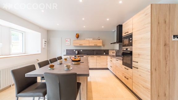 - Une cuisine équipée avec notamment : bouilloire électrique, four, four à micro-ondes, grille-pain, lave-vaisselle, plaques de cuisson, cafetière à filtre et une machine à café Tassimo a capsule.