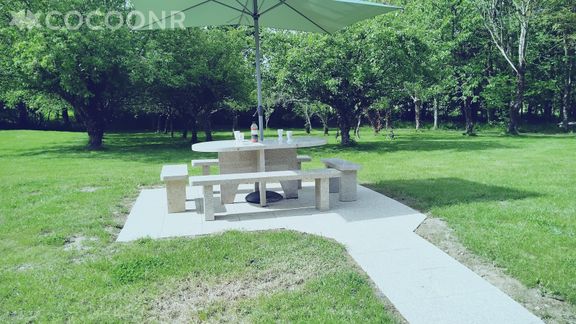 - Une terrasse de 50 m² exposée plain sud, en façade jouxtant la cour, avec salon en pierre pour 8 personnes, parasol et petit salon de jardin (3 places)