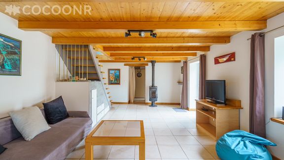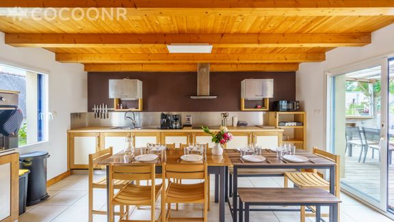 - Une pièce à vivre de 50 m² avec TV, canapés, espace repas et cuisine ouverte équipée avec notamment : bouilloire électrique, four, four à micro-ondes, grille-pain, lave-vaisselle, plaques de cuisson...