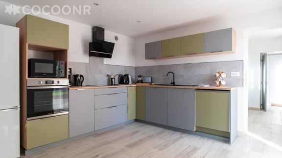 - Une cuisine ouverte équipée avec notamment : lave vaisselle, bouilloire électrique, four, four à micro-ondes, grille-pain, plaques de cuisson...
