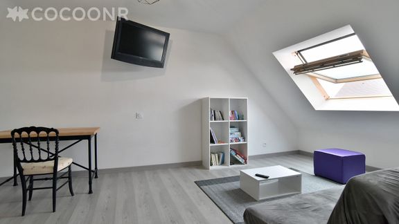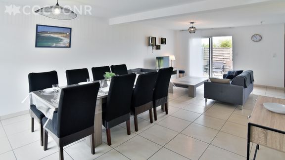 - Une pièce de vie de 27 m² avec un canapé, fauteuil, table basse, espace repas, TV