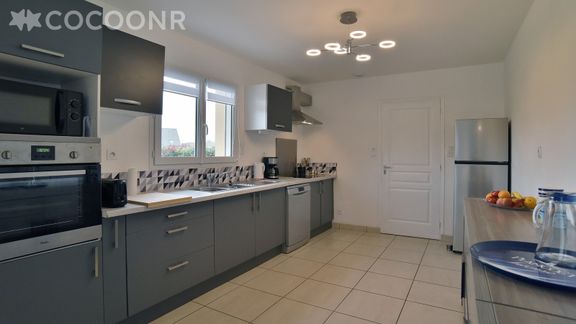 - Une cuisine ouverte équipée avec notamment : bouilloire électrique, four, four à micro-ondes, grille-pain, lave-vaisselle, plaques de cuisson...