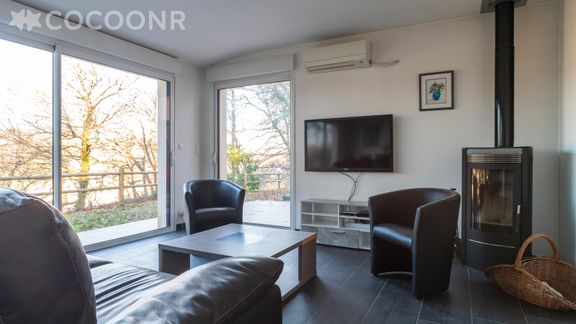 - Une pièce de vie de 50 m² avec TV, Wifi inclus, cheminée (bois non fourni), canapé, fauteuils et espace repas.