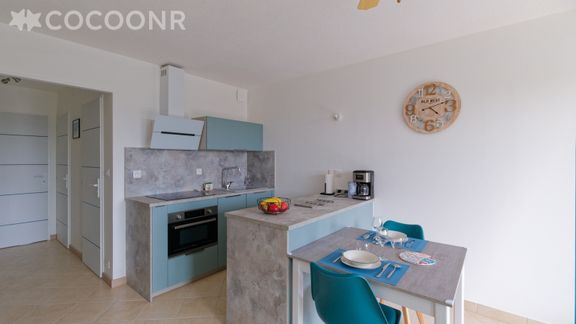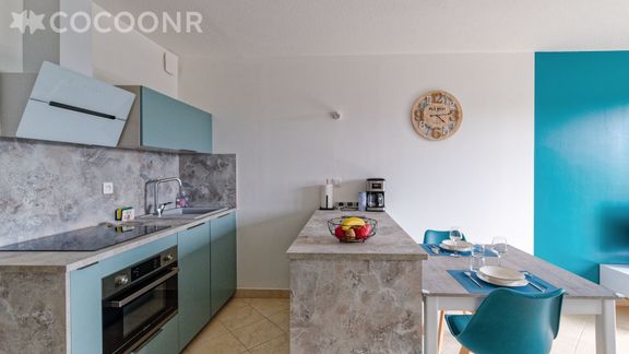 - Une cuisine équipée avec notamment : bouilloire électrique, four, four à micro-ondes, grille-pain, lave-vaisselle, plaques de cuisson...
