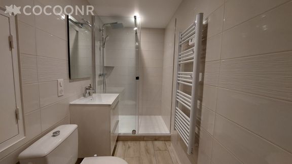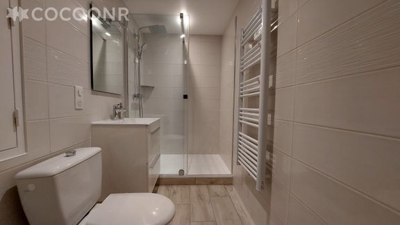 La salle d'eau dispose d'une douche, d'un sèche-serviettes, d'une vasque et de toilettes.