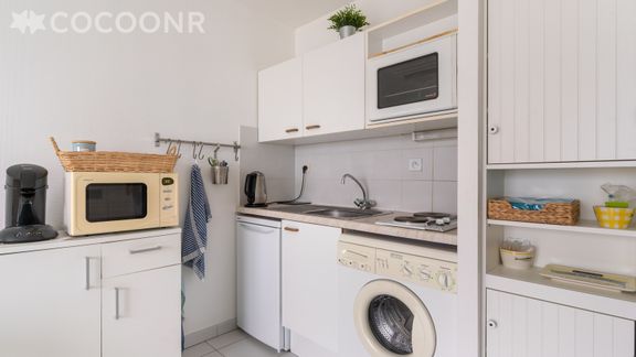 Après avoir passé l'entrée (avec espaces de rangement disponibles), la pièce de vie, lumineuse et fonctionnelle, se compose d'un espace salon TV (canapé convertible pour 2 personnes), d'une table à manger et d'une kitchenette entièrement équipée : réfrigérateur, four électrique, plaques électriques, micro-ondes, grille-pain, bouilloire, cafetière Senseo… Un lave-linge vient compléter les équipements.