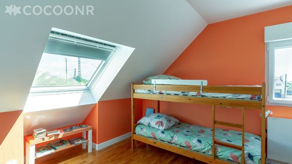 - Chambre 2 avec vue mer : deux lits simples superposés (idéal pour des enfants), un canapé-lit double et une armoire.