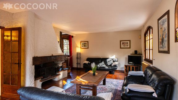 - Une grande pièce de vie de 70 m² avec canapés, télévision, cheminée (bois non fourni) et espace repas.