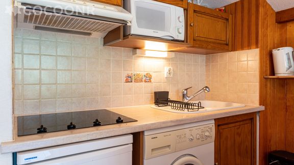 - Une cuisine ouverte équipée avec notamment : bouilloire électrique, four, four à micro-ondes, grille-pain, lave-vaisselle, plaques de cuisson...