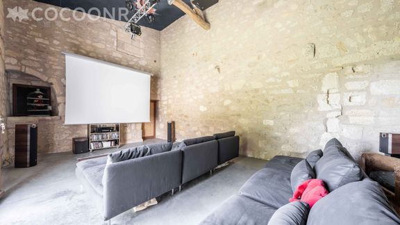 - Une pièce de vie avec un home cinéma et une kitchenette