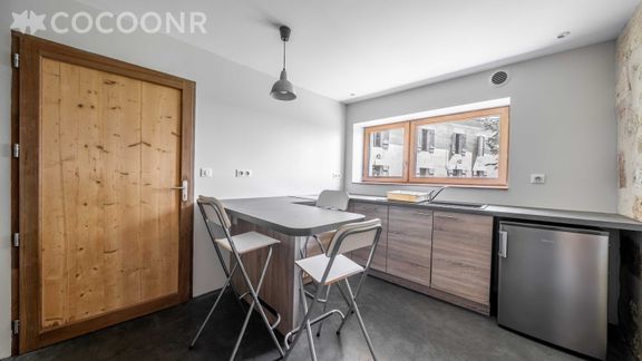 - Une cuisine ouverte équipée avec notamment : bouilloire électrique, four, four à micro-ondes, grille-pain, lave-vaisselle, plaques de cuisson...