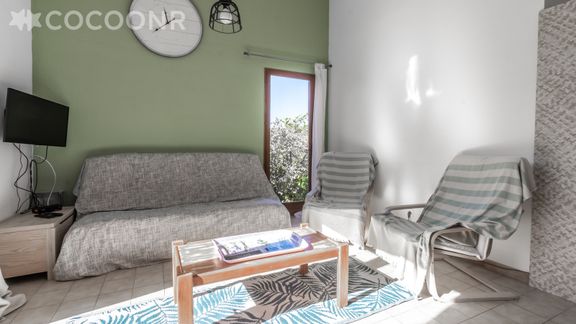 - Une pièce de vie avec de 16 m², TV, canapé, fauteuils et un coin repas