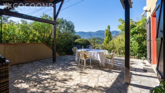 Une terrasse exposée sud de 40 m² avec du mobilier pour profiter des beaux jours, offrant une vue dégagée sur les Pyrénées Audoises.