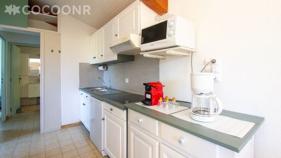 - Une cuisine équipée avec notamment : bouilloire électrique, four à micro-ondes, lave-vaisselle, plaque vitrocéramique avec 4 feux, hotte, réfrigérateur avec congélateur en haut, cafetière et machine à café à capsule Nespresso