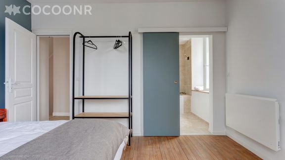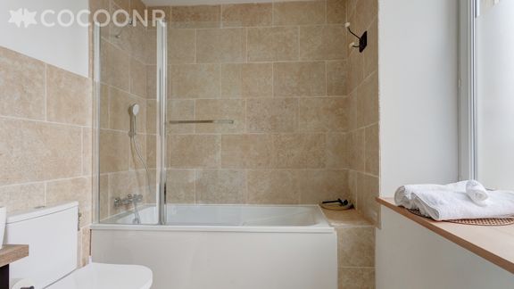 - Chambre 2 : un lit queen-size (160x200) avec salle de bain attenante (avec baignoire, vasque, miroir lumineux et WC)
