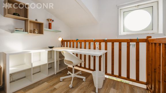En mezzanine, vous trouverez un espace nuit avec un lit double (140×190) et un bureau