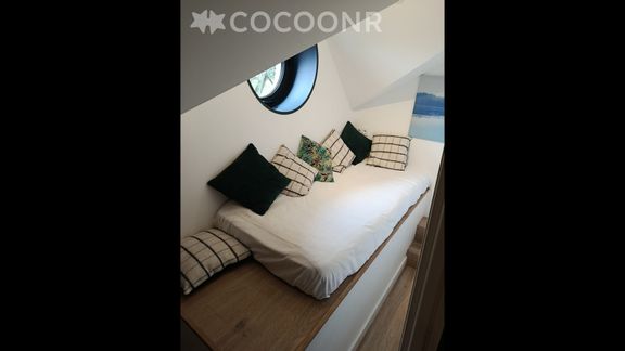 - Une deuxième pièce que l'on pourrait nommer espace détente . ( Avec un lit , coussins et plaid ) . Le lieu idéal pour se reposer avec un livre ou une tablette , ambiance bateau ( présence d'un hublot ) .