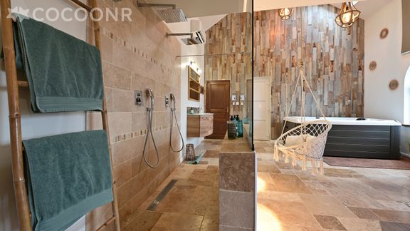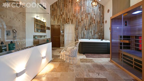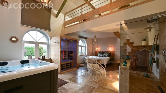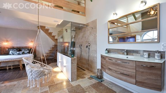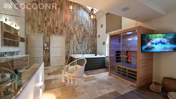- Une pièce de vie de 40 m² avec TV, fauteuil suspendu, lit king-size (180×200), ciel étoilé au dessus, jacuzzi et sauna.