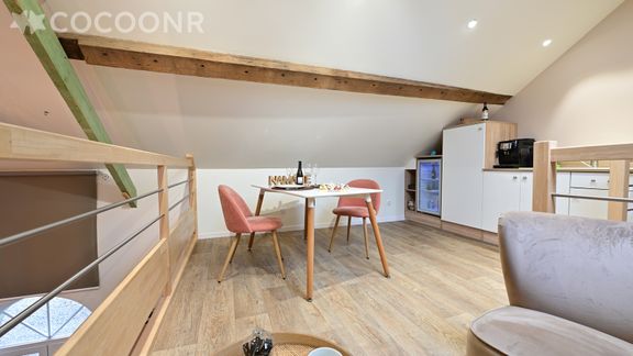 Nous vous proposons à la location, sur la commune de Rocquigny, ce charmant studio mezzanine climatisé, avec jacuzzi et sauna, d’une superficie de 50 m² et pouvant accueillir confortablement 2 voyageurs. Il est composé d’une jolie pièce à vivre de 40 m², d'une kitchenette ouverte équipée, une belle chambre et une salle d'eau. Wifi (fibre optique), draps et serviettes inclus. Petit déjeuner inclus. Plateau d'accueil avec champagne, vin et premier repas du soir offert. Idéal pour un week-end en amoureux, nous n’attendons plus que vous !