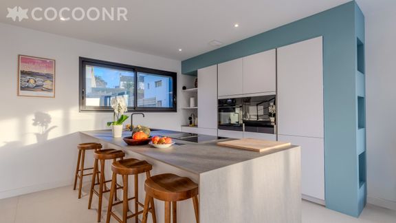 - Une cuisine équipée avec notamment : bouilloire électrique, four, four à micro-ondes, grille-pain, lave-vaisselle, plaques de cuisson et espace repas