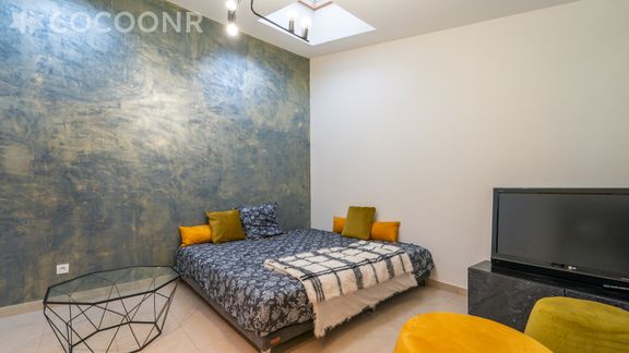 - Une pièce de vie de 28 m² avec canapé-lit double et simple, TV