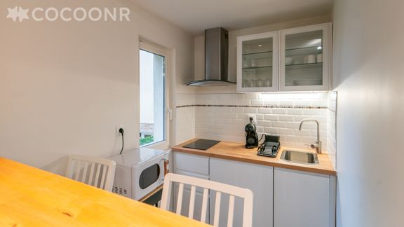- Une cuisine ouverte équipée avec notamment : bouilloire électrique, four, four à micro-ondes, grille-pain, plaques de cuisson...