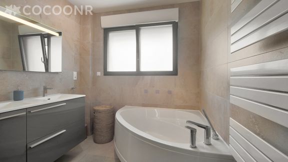 - Une salle de bain familiale avec baignoire et douche, doubles vasques