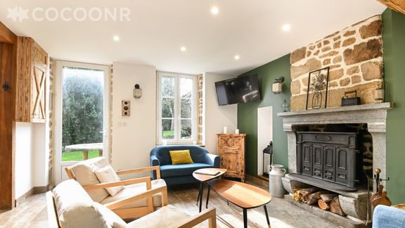 - Une pièce de vie de 35 m² avec TV, fauteuils, cheminée (bois fourni)