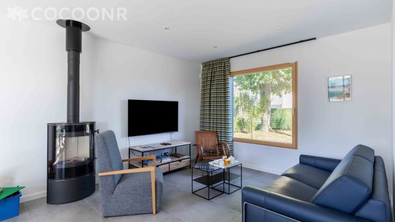 - Une pièce de vie de 35 m² avec TV, canapé et coin repas