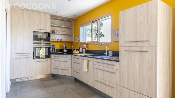 - Une cuisine ouverte équipée avec notamment : réfrigérateur, four, four à micro-ondes, lave-vaisselle, plaques de cuisson, machine à café avec broyeur intégré, bouilloire électrique, grille-pain…