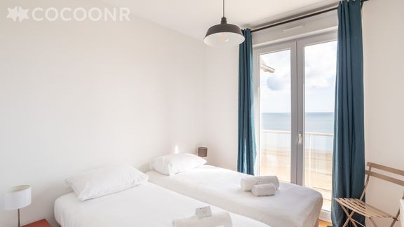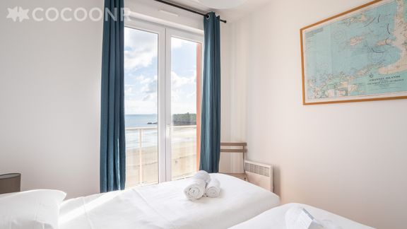 - Une chambre double (2 lits simples possibilité de les réunir), une salle de bain attenante, vue mer