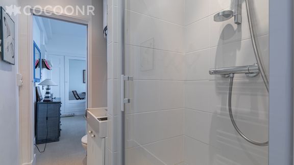 - Depuis le séjour, en enfilade, vous accédez à la salle de douche avec WC puis à la chambre équipée de 2 lits simples. La terrasse est également accessible depuis la chambre.