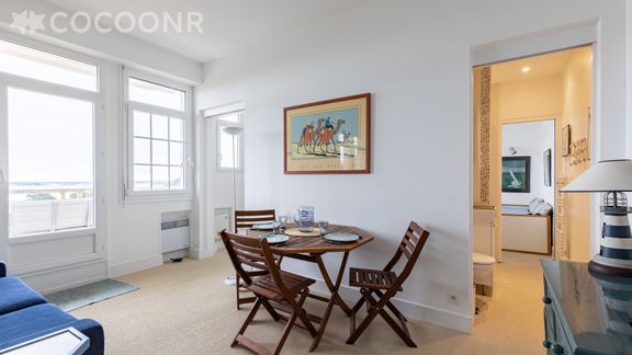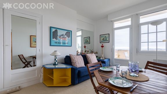 Situé dans un bel immeuble historique au style art-déco, avec sa grande terrasse donnant sur la baie de Saint-Cast et la plage de Pen-Guen. L'appartement jouit d'un emplacement véritablement unique, au pied de la plage et du parcours de golf de Saint-Cast.