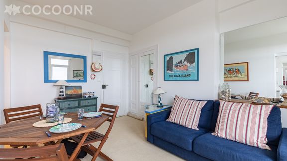 - Une agréable pièce de vie avec une grande terrasse (40 m², exposée Est) d'où vous pourrez profiter d'une magnifique vue mer à 180°. Le canapé dans le salon est convertible en lit double pour 2 personnes. Vous pourrez bénéficier d'une Smart TV connectée au Wifi.