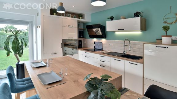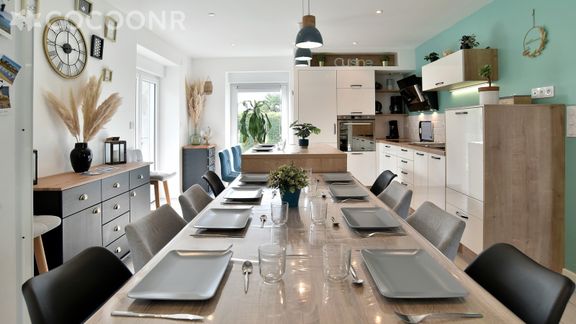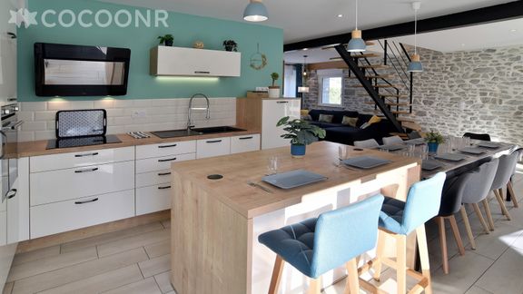 - Une cuisine équipée avec notamment : bouilloire électrique, four, four à micro-ondes, grille-pain, lave-vaisselle, plaques de cuisson... et un coin repas