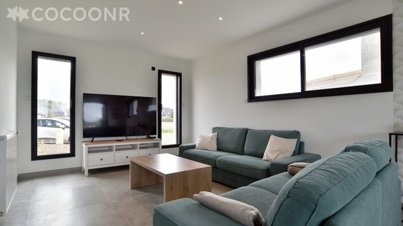- Une pièce de vie de 44 m² avec canapés, TV, coin repas