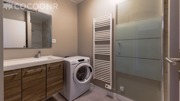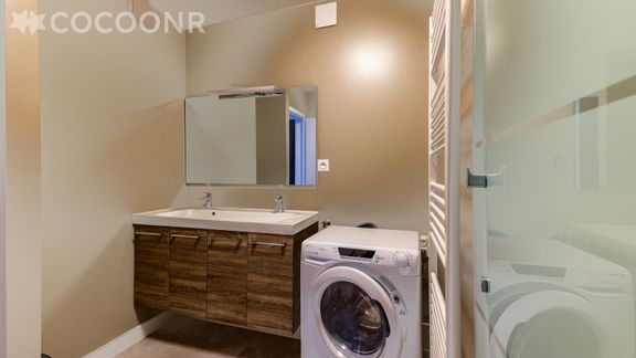 - Une salle d'eau avec une grande douche à l'italienne, une double vasque, un sèche-serviette chauffant, une machine à laver et un sèche-cheveux.