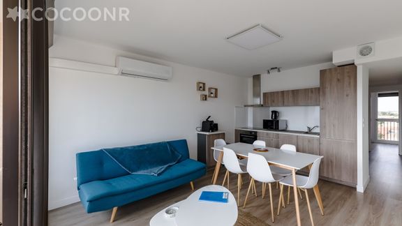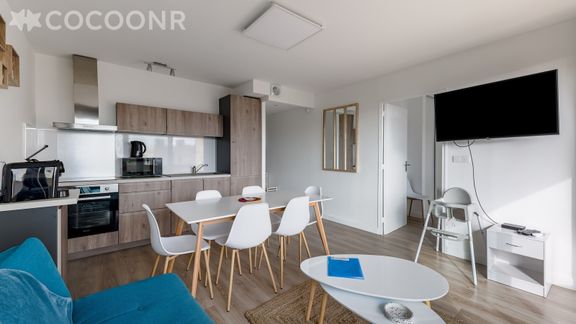 - Une belle pièce de vie lumineuse avec un coin salon doté d'un canapé-lit, une table basse, une TV (smart TV) ainsi qu'un espace repas avec une table à manger pouvant accueillir jusqu'à 6 convives.