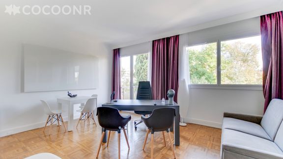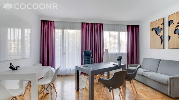 - Salon séjour aménagé avec grand bureau, canapé-lit 2 places, table à manger et TV
