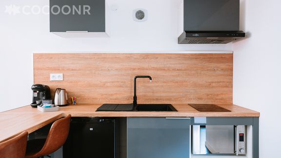- Une kitchenette équipée avec notamment : machine à café à dosette , bouilloire électrique, four/four à micro-ondes, plaques de cuisson...
