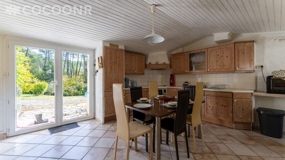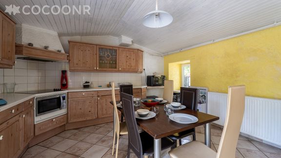 - Une cuisine équipée (également accessible depuis le jardin) avec notamment : bouilloire électrique, four, four à micro-ondes, grille-pain, lave-vaisselle, plaques de cuisson, senseo, cuiseur à riz, appareil à raclette, mini-crêpe...